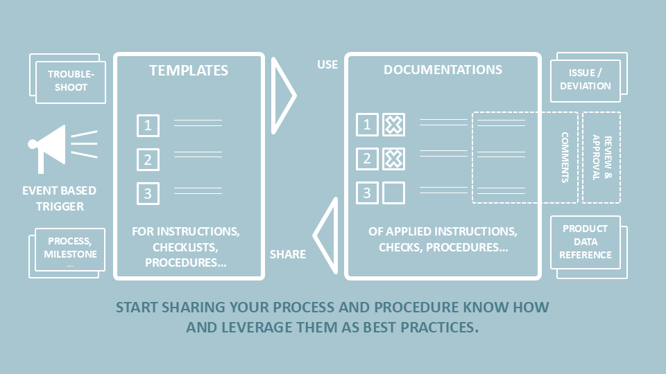 We intend to enhance your Engineering operations and collaboration by managing standard operating procedures, work instructions, guidelines, onboarding manuals, checklists or other best practices in a central place, providing them to your engineering teams and partners for day-to-day use. By this your engineers are supported in their daily work – reusing and continuously enhancing the knowledge and best practices of your company.