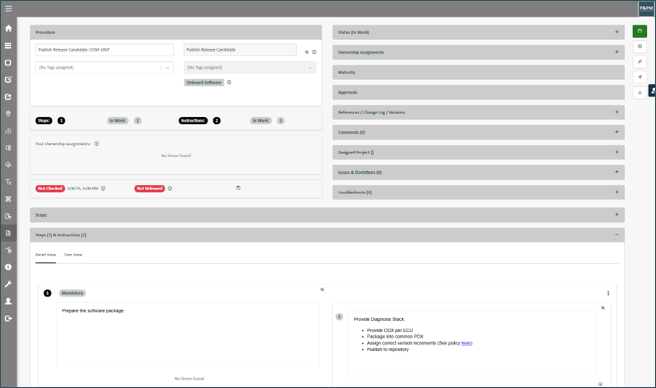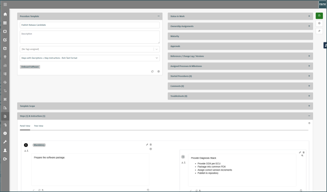 Derive specific procedures or checklists from your templates per event (for instance per design review etc.). Assign applicable ownerships to each procedure to manage the responsibilities per event.